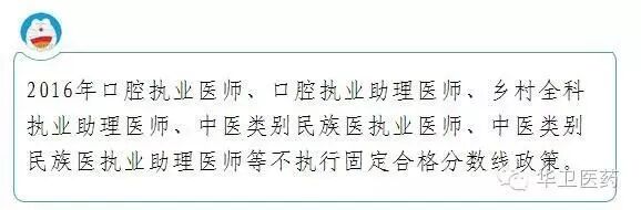经国家卫生计生委医师资格考试委员会2016年12月2日全体会议研究决定,自2016年起,医师资格考试医学综合笔试部分类别执行固定合格分数线,分别为: